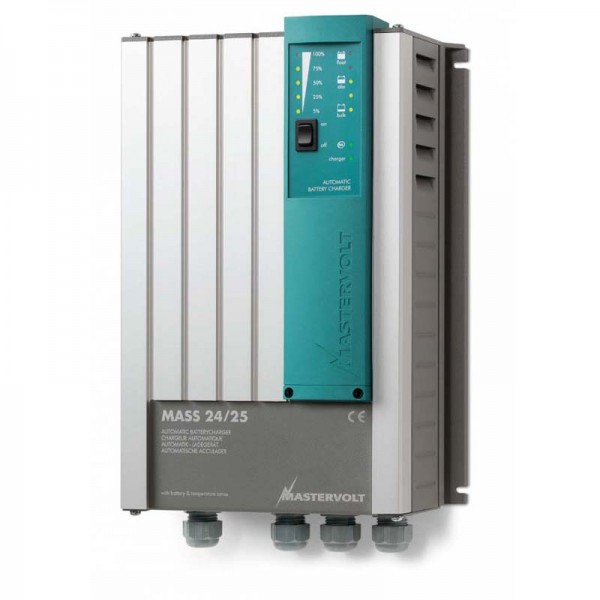 Cargador de baterías Mastervolt Mass 24/25, versión Masterbus. Corriente de carga 25 Amp.(24V) 1 Salida de 25 Amp para baterías de servicios, más otra salida de 3 Amp para carga de baterías de motor. Voltaje de entrada de 180 a 260 VAC. Frecuencia 50/60 Hz. Consumo a plena carga <5 mA. Carcasa tipo C1