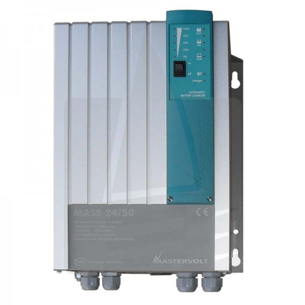 Cargador de baterías Mastervolt Mass 24/50, versión Masterbus. Corriente de carga 50 Amp.(24V) 1 Salida de 50 Amp para baterías de servicios, más otra salida de 3 Amp para carga de baterías de motor. Voltaje de entrada de 180 a 260 VAC. Frecuencia 50/60 Hz. Consumo a plena carga 1800VA, consumo sin carga 14W. Carcasa tipo C2