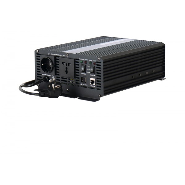 Inversor y Cargador de corriente CARBEST de 1000 W de Onda Pura y Prioridad a Red. Transforma la corriente de 12 V de la batería a 230 V con un consumo nominal de 1000 W. En caso de estar conectado a la red eléctrica actúa de distribuidor, pasando a alimentar la instalación desde el exterior a la vez que carga la batería.
