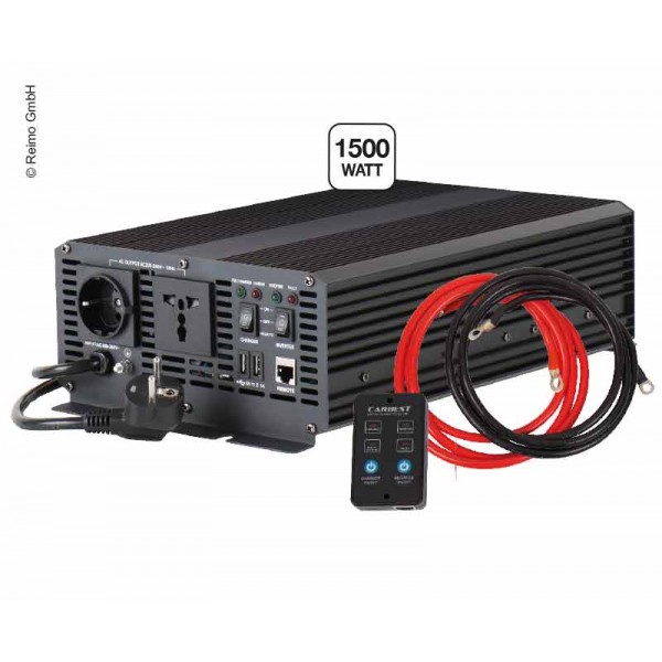 Inversor y Cargador de corriente CARBEST de 1500 W de Onda Pura y Prioridad a Red. Transforma la corriente de 12 V de la batería a 230 V con un consumo nominal de 1500 W. En caso de estar conectado a la red eléctrica actúa de distribuidor, pasando a alimentar la instalación desde el exterior a la vez que carga la batería.