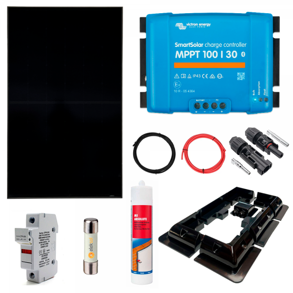 Kit solar especialmente diseñado para el apoyo de energía en autocaravanas y embarcaciones. Compuesto de panel monocristalino FullBlack IBC de 400W, regulador solar MPPT Victron con conexión Bluetooth para poder monitorizar y configurar los parámetros de carga. En este kit se suministra cableado de conexión entre equipos, protecciones, conector MC4, estructura de techo para panel y adhesivo de montaje.