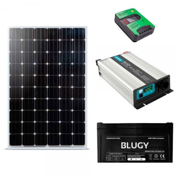 Pack de Energía Estándar Blugy, con batería AGM, Inversor y Panel solar, formado por los siguientes componentes: