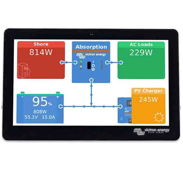 GX TOUCH 50 es la pantalla accesorio de la monitorización CERBO GX. Con ella podrás tener una visión general e instantánea del sistema solar fotovoltaico y ajustar los parámetros al momento.